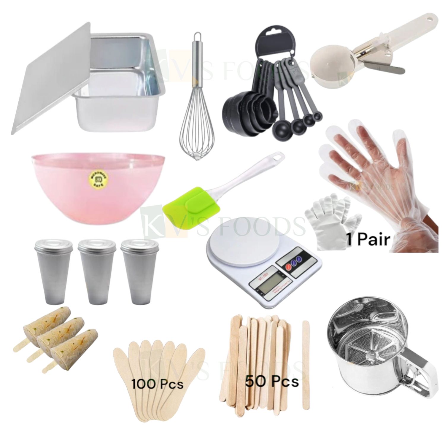 Multicolor, All in one Combo Set for Ice-cream, Kulfi Making, Beginner Accessories, Kitchen Tools, Kulfi Making Supplies, Combo Kit, Kulfi Mould, Ice-cream Tray, Whisker, Measuring Cups, Sticks Spoon